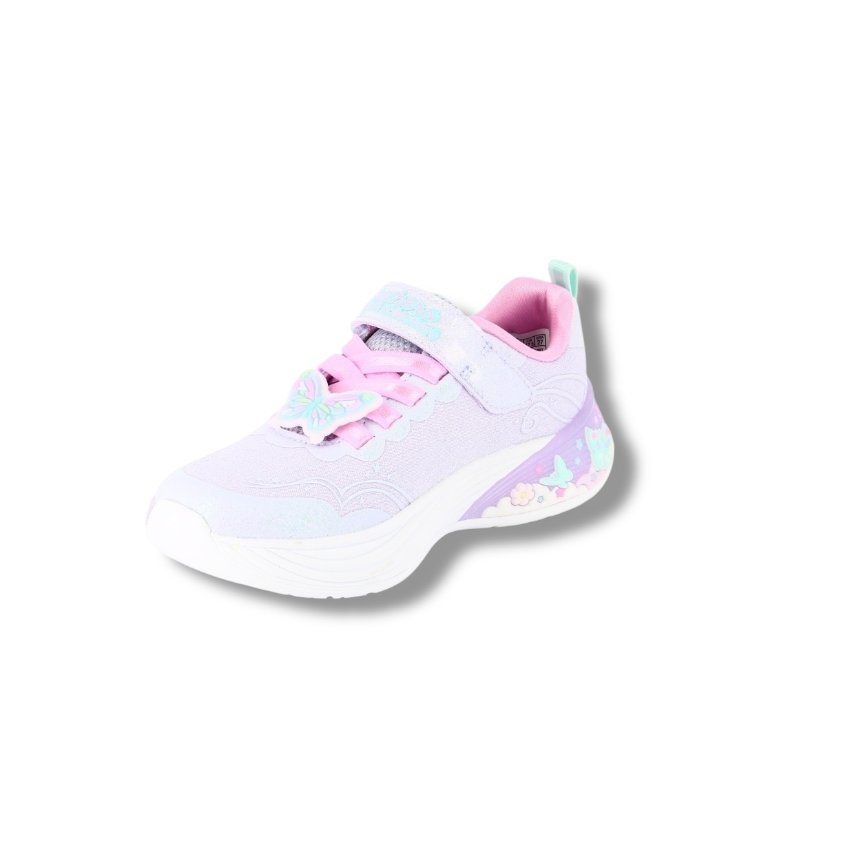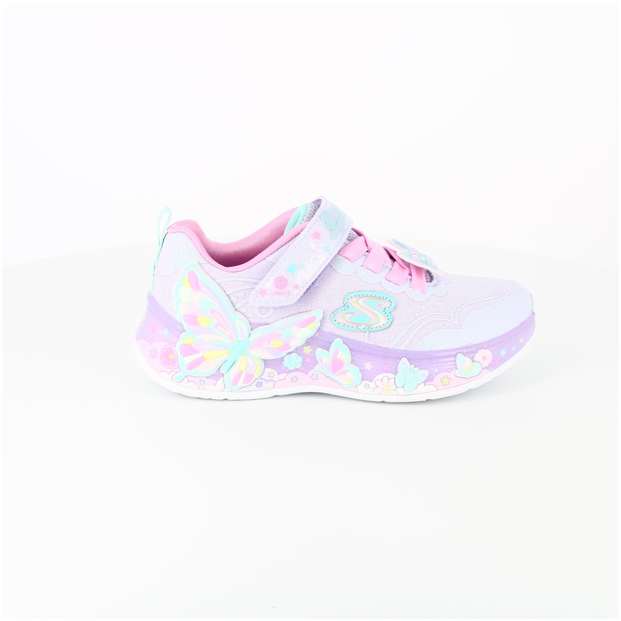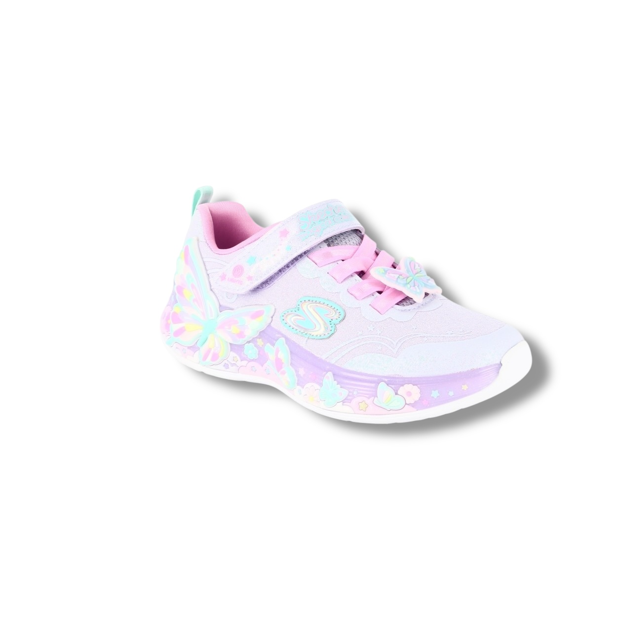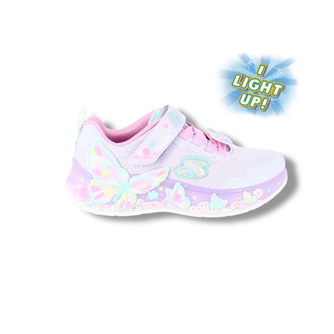 Illuminez votre journée avec la Skechers® S-Lights® : Butterfly Bliss. Cette chaussure lumineuse de la Magical Collection™ sur le thème des papillons présente une tige en mesh pailleté et matière synthétique, un passe-lacets papillon, la fermeture adaptative Skechers, des lacets extensibles, une semelle intermédiaire ornée de papillons et une semelle intérieure coussinée pour un confort optimal.