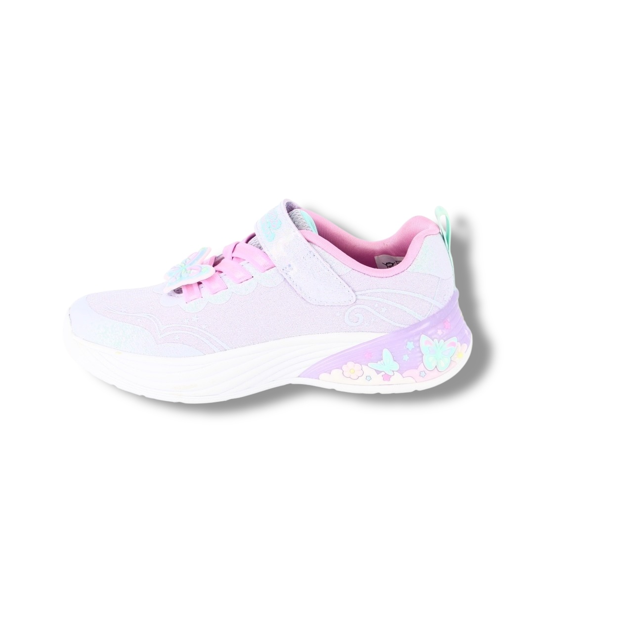 Illuminez votre journée avec la Skechers® S-Lights® : Butterfly Bliss. Cette chaussure lumineuse de la Magical Collection™ sur le thème des papillons présente une tige en mesh pailleté et matière synthétique, un passe-lacets papillon, la fermeture adaptative Skechers, des lacets extensibles, une semelle intermédiaire ornée de papillons et une semelle intérieure coussinée pour un confort optimal.